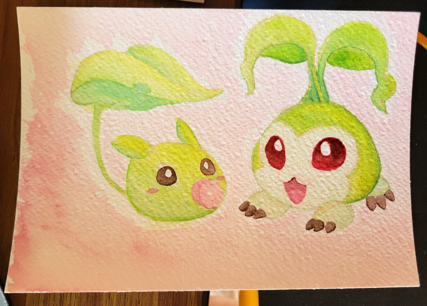 A 5x7 inch watercolor painting of Tanemon and Leafmon.