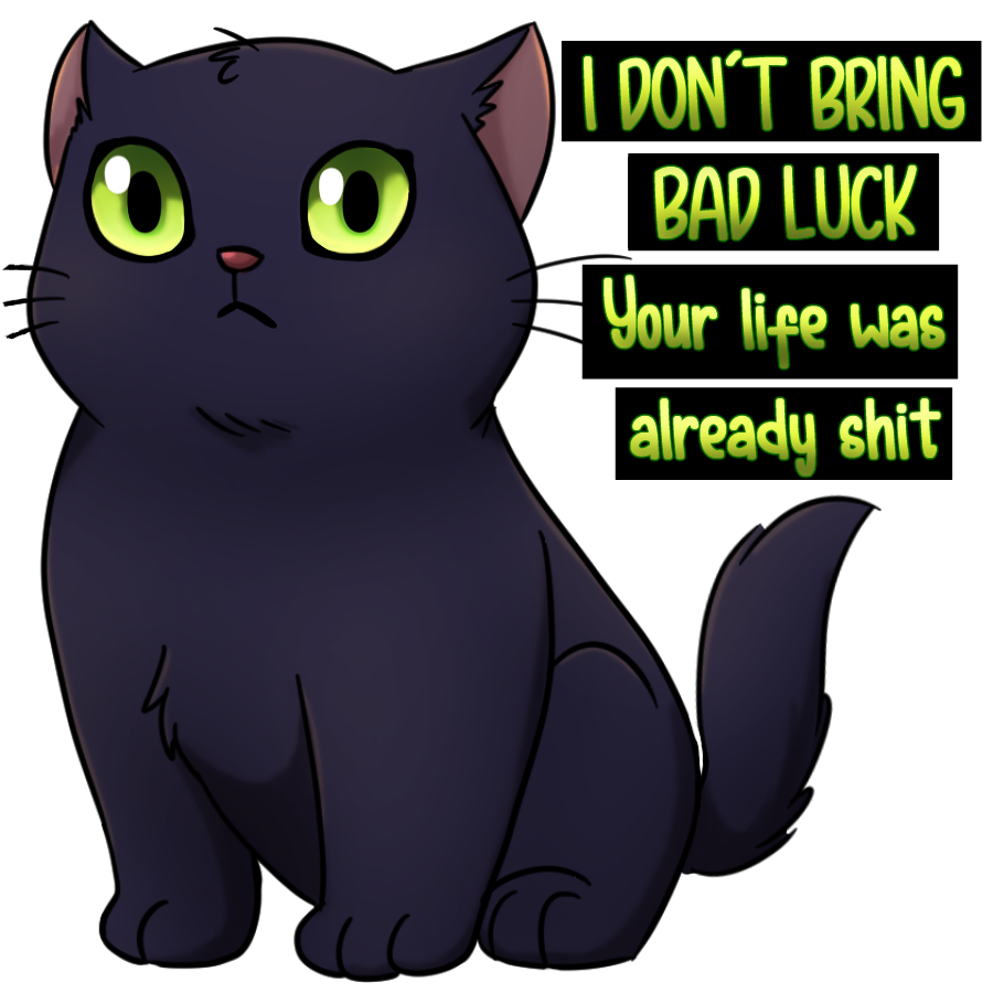 A 3 inch sticker on a black cat reminding you that black cats don't bring bad luck.