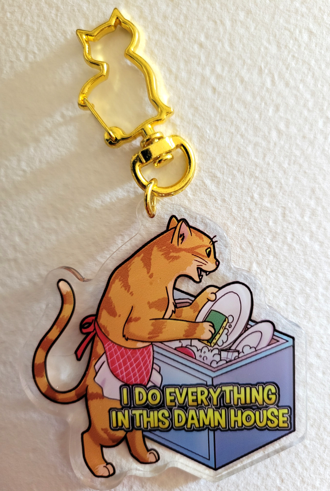 2.5 inches tall acrylic keychain of an orange cat who does everything in this house.