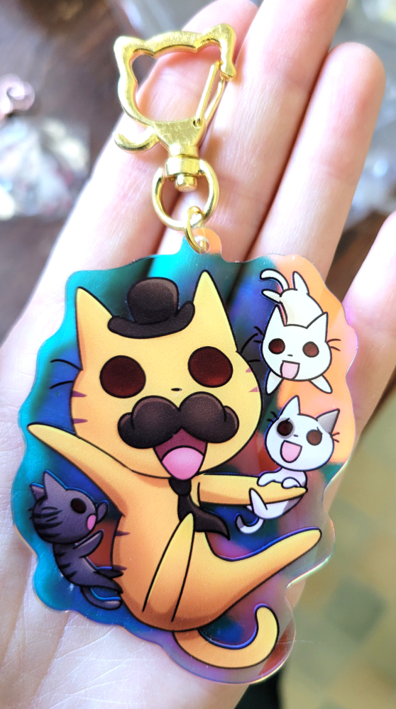 Double-sided 3 inch tall acrylic charm keychain of Mr.Cat and his 3 kittens. The back is rainbow-y and changes with the light! Super shiny and cute!