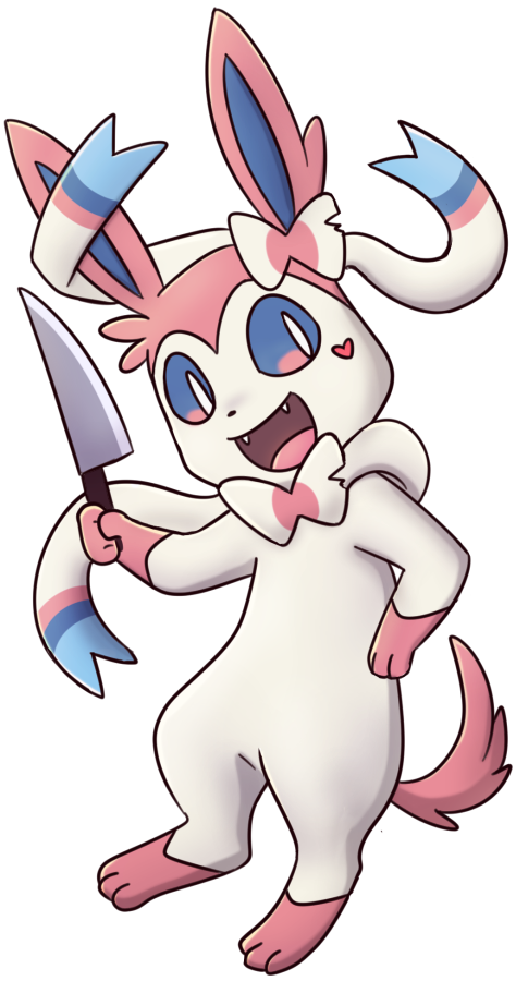 Double-sided 3 inch tall acrylic charm keychain of Syl from Problematic Eeveelutions. Watch out, he has a knife! :O