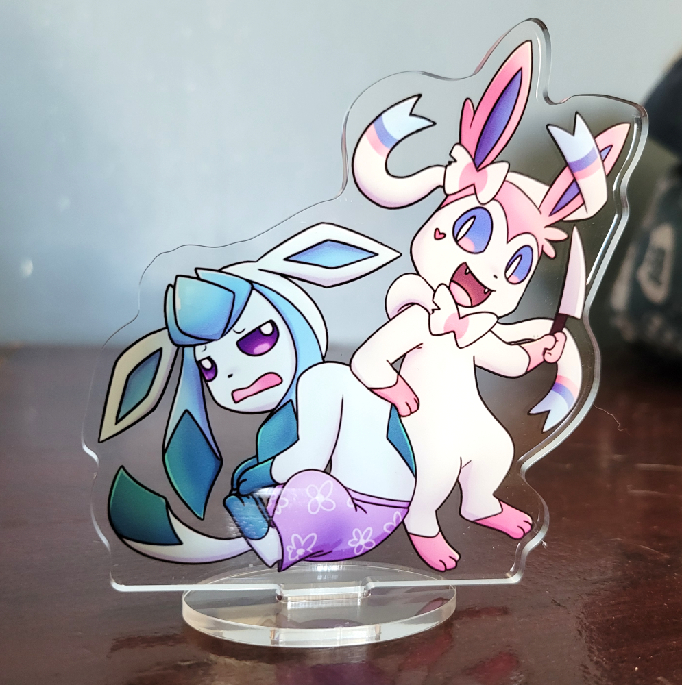 Double-sided, 100mm (3.9") acrylic standee of Syl and Glace from Problematic Eeveelutions! Watch out, he has a knife D: