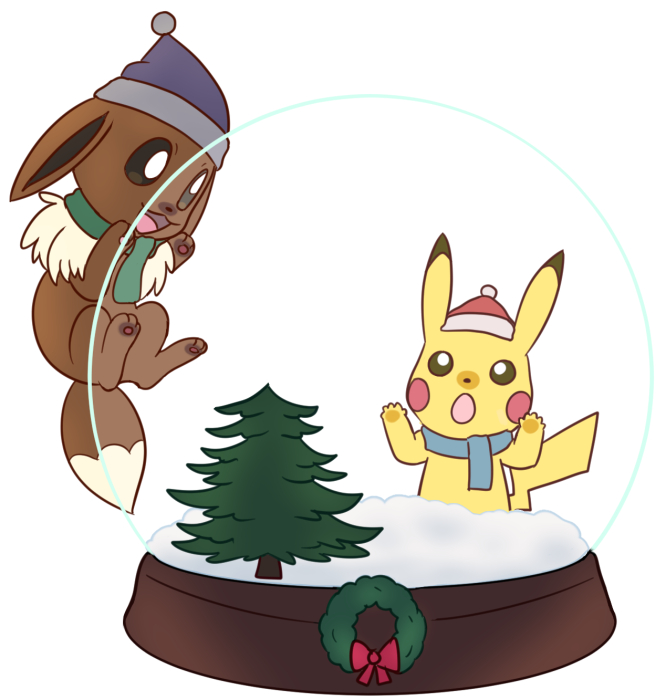 2.5inch sticker of Eevee and Pikachu looking at a snow globe. It has glitterry dots!